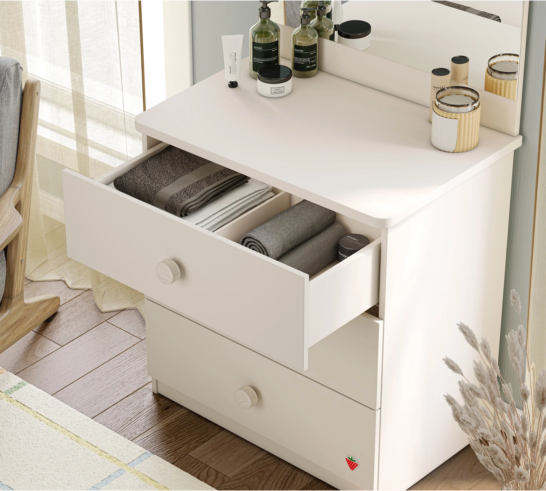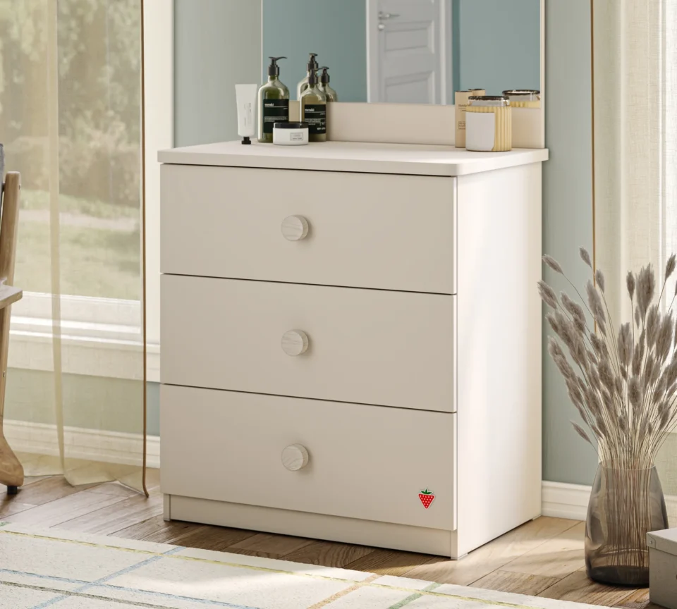 Predalnik Varia ima tri predale z mehanizmom mehkega zapiranja, ki imajo zaobljene ročaje. Predalnik je delo priznanega proizvajalca pohištva Cilek. Ima zaščito z melaminom, ki je odporen zoper prask in prahu.