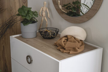 - Ročaji: Ročaji na predalih so izdelani v privlačnih zemeljskih tonih, ki dodajajo kontrast in vizualni interes beli osnovi s lesnim vzorcem. Njihova oblika in barva prispevata k edinstvenemu in sodobnemu izgledu predalnika.