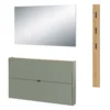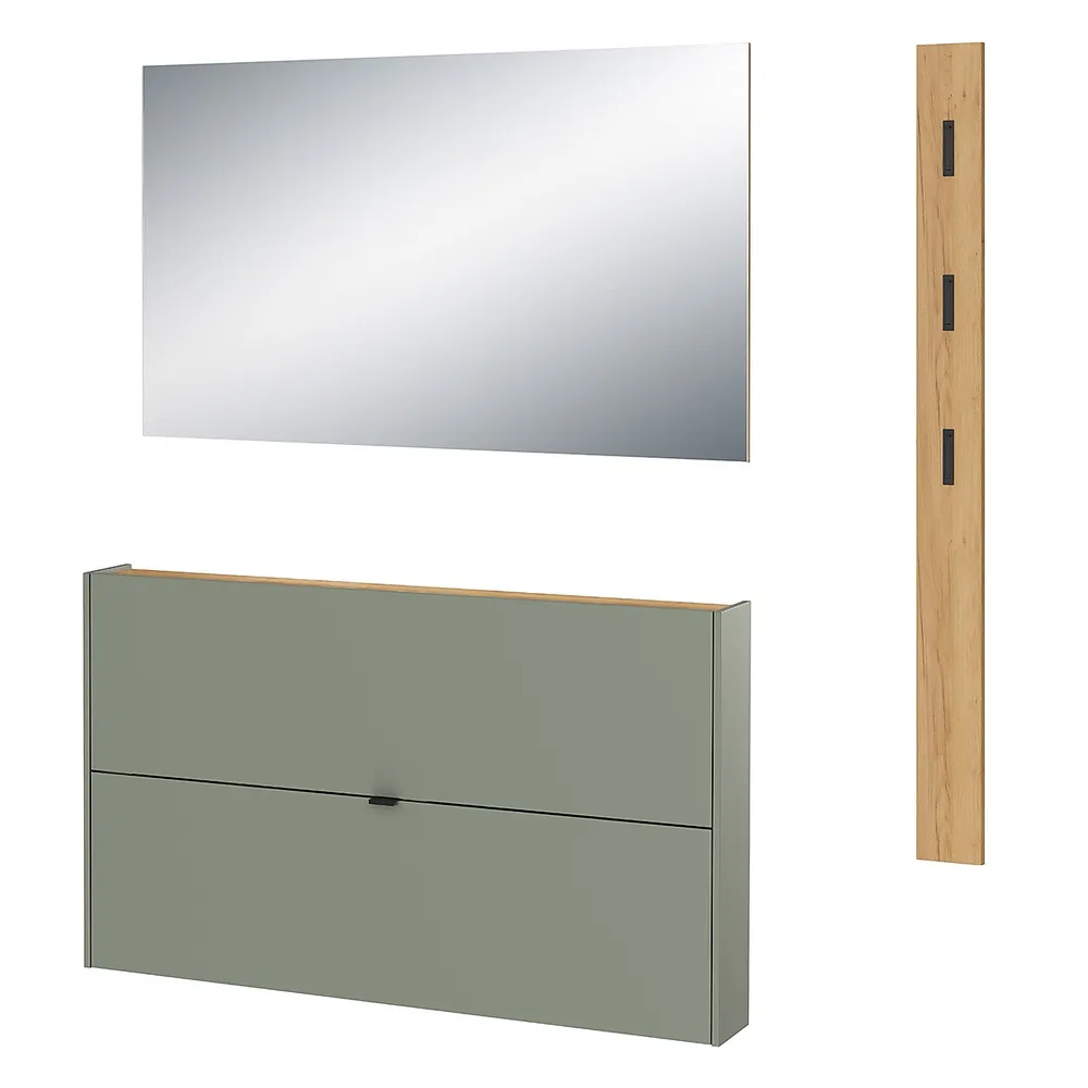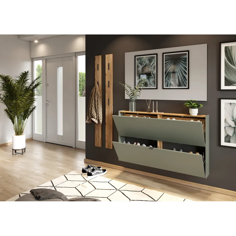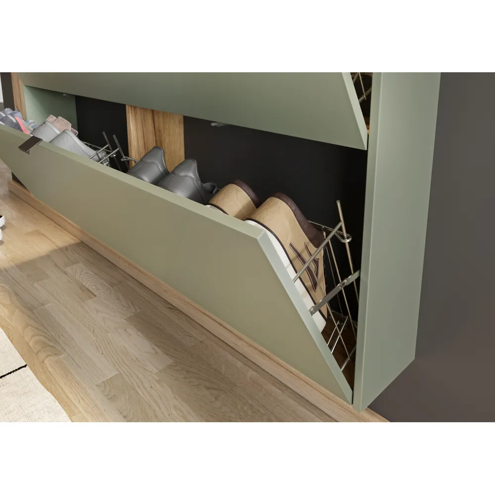 Omarica za čevlje Ameca 1392 združuje sodoben dizajn, optimalno funkcionalnost in kompaktno globino, zato je idealna za organizacijo obutve v hodniku ali predsobi. Kombinacija taupe zelene barve in dekorja hrasta Navarra prostoru doda toplino in sodoben videz.