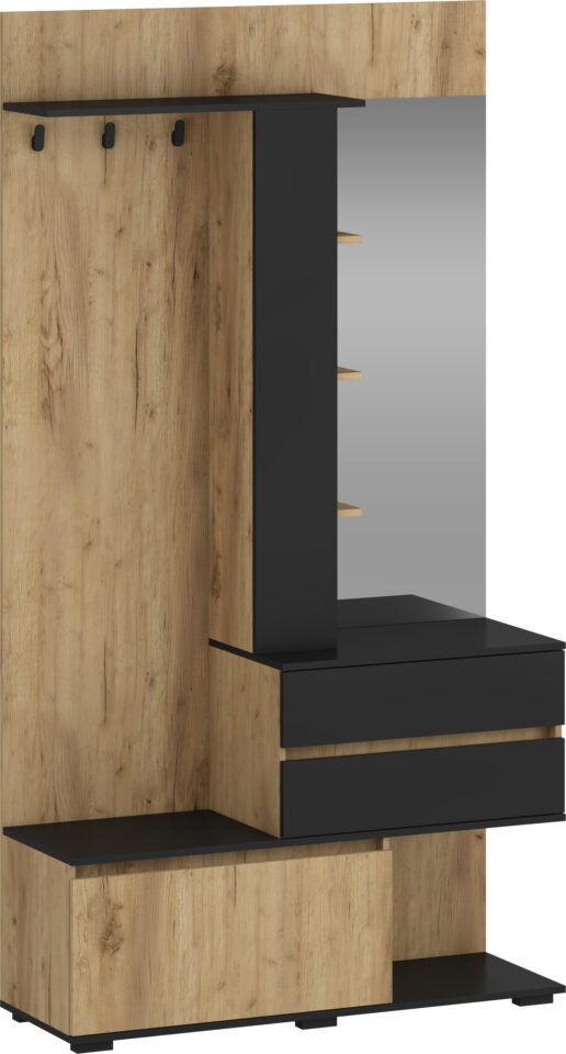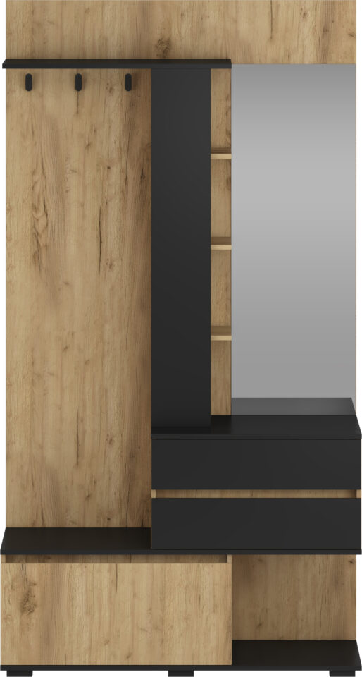 Sestavljena je iz več praktičnih elementov, ki omogočajo urejeno shranjevanje in enostavno uporabo. Vključuje obešala za plašče in jakne, prostoren poličnik za odlaganje ter veliko ogledalo, ki je idealno za hiter pregled pred odhodom od doma. Dodatno ima dva predala za manjše predmete ter omarico z dvižnimi vrati, ki omogoča diskretno shranjevanje.