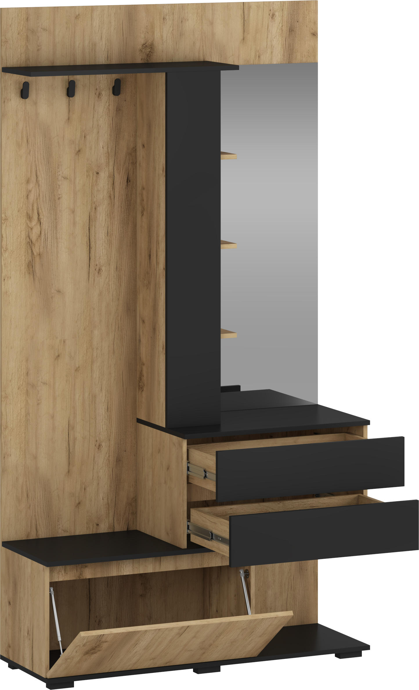 Sestavljena je iz več praktičnih elementov, ki omogočajo urejeno shranjevanje in enostavno uporabo. Vključuje obešala za plašče in jakne, prostoren poličnik za odlaganje ter veliko ogledalo, ki je idealno za hiter pregled pred odhodom od doma. Dodatno ima dva predala za manjše predmete ter omarico z dvižnimi vrati, ki omogoča diskretno shranjevanje.