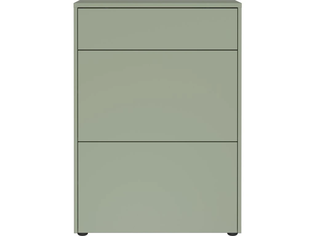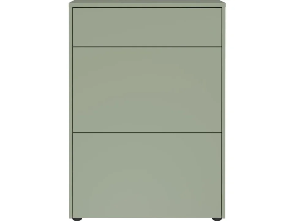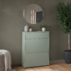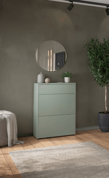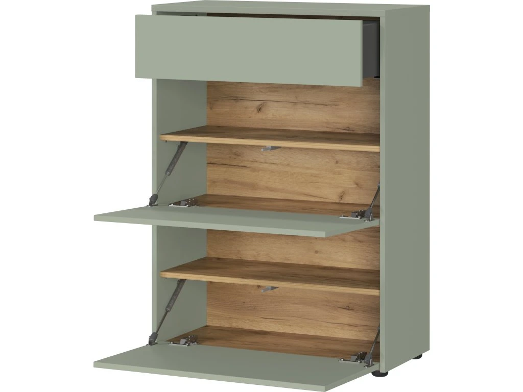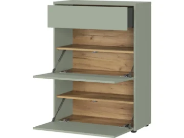 - Omarica za čevlje GW-Binetto (70 x 99 x 34 cm) je premišljeno zasnovan kos pohištva za predsobo, ki združuje sodoben dizajn z naravnimi barvnimi toni. Kombinacija taupe zelene in dekorja Navarra hrasta v notranjosti omare poskrbi za eleganten in topel videz.