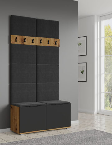 - Omarica za čevlje, ki služi tudi kot klop za sedenje. Lahko izbirate v abarvi Hrast, Hrast/grafit, Hrast/bela, Bela. Ročaj je v vseh variantah grafitne barve.