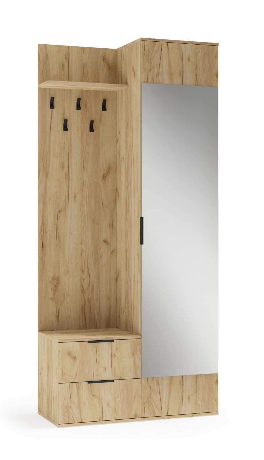 Predsoba Coral združuje tradicionalni slog s sodobno funkcionalnostjo. Ohišje v barvi zlatega hrasta ustvarja topel, naraven vtis, medtem ko bela barva vrat poskrbi za svežino in čist videz prostora. Zrcalo na vratih dodatno optično poveča prostor in omogoča praktično uporabo v vsakdanjem ritmu.