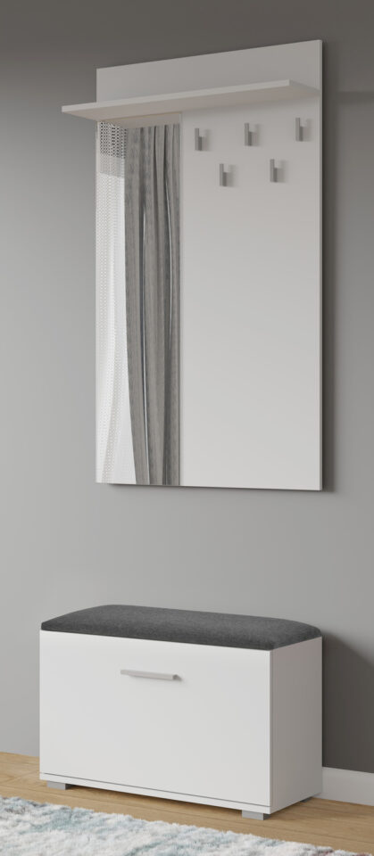Izdelan je iz kakovostne laminirane iverne plošče, ki je odporna na vsakodnevno uporabo, ter dopolnjen z ogledalom za priročno zadnje preverjanje pred odhodom od doma.