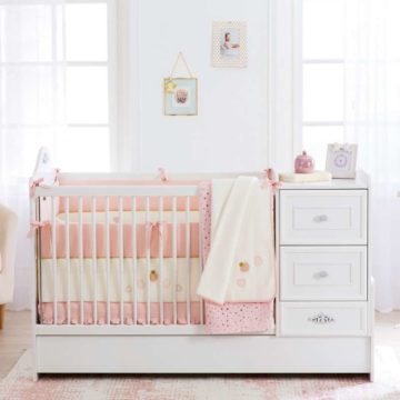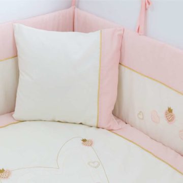 Posteljnina Queen Baby je narejena iz najboljšega bombaža in je sestavljena iz prevleke za vzmetnico, zaščitne ograje, pregrinjala, odeje, okrasne blazine in prevleke za vzglavnik. Nežni toni in okrasno vezenje z motivom srca ji dajejo poseben čar.