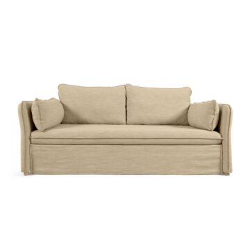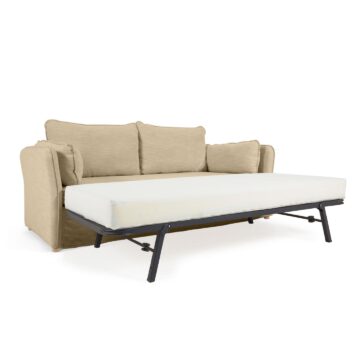 Raztegljiv kavč Tanit v bež barvi – 210 cm je zasnovan z mislijo na dolgo življenjsko dobo. Njegove noge iz masivnega bukovega lesa z naravnim zaključkom zagotavljajo trdnost in stabilnost, medtem ko materialna sestava vključuje reciklirana vlakna, kar prispeva k okolju prijazni izbiri.