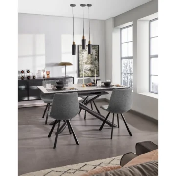 Prožnost s Stilom Z elegantnim satiniranim steklom in subtilno raztegljivo funkcijo, se tako prilagodi vašim potrebam. Pri minimalni širini 160 cm zagotavlja udobje za vašo družino, medtem ko se razteza do 210 cm, ko gostje potrkajo na vrata. Strukturna Eleganca Prekrižane noge ne le ponujajo vizualne lepote, ampak tudi omogočajo več prostora za noge, zagotavljajoč dodatno udobje vašim gostom. Elegantna zasnova mize je zaključena z matiranimi, prašno barvanimi jeklenimi nogami, ki nudijo stabilnost in robustno podporo. Izbirate lahko med dvema barvama mizne plošče: