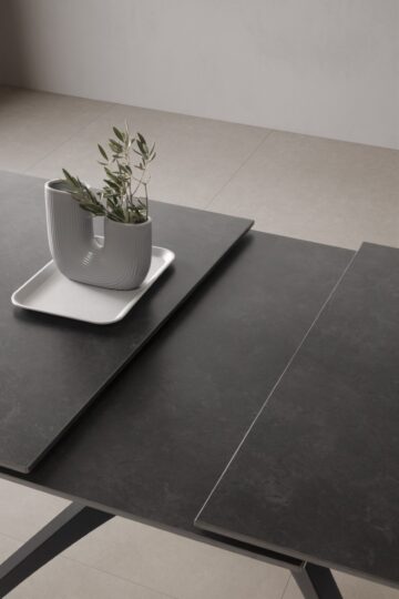 Jedilna miza BECA ima površino iz trpežne kamnite prevleke, ki zagotavlja odpornost na praske in enostavno čiščenje, medtem ko kovinski okvir nudi stabilnost in sodoben videz. Unikatna tekstura kamnite prevleke doda mizi poseben čar. BECA je primerna za različne prostore, od jedilnice do dnevne sobe. Raztegljivost do 200 cm omogoča prilagoditev potrebam, bodisi za vsakodnevne obroke ali večja druženja.