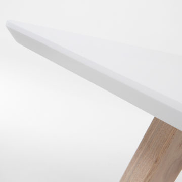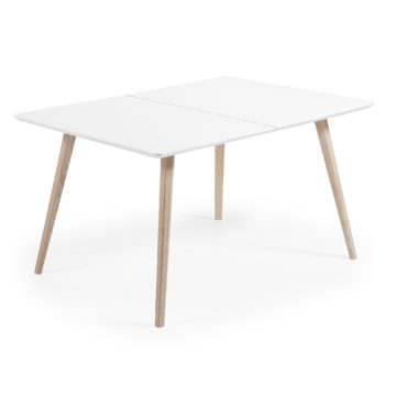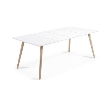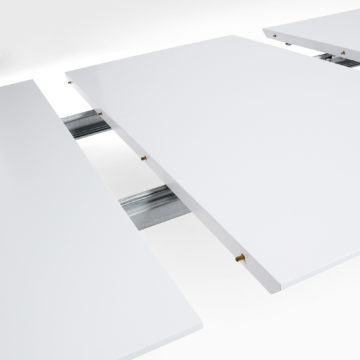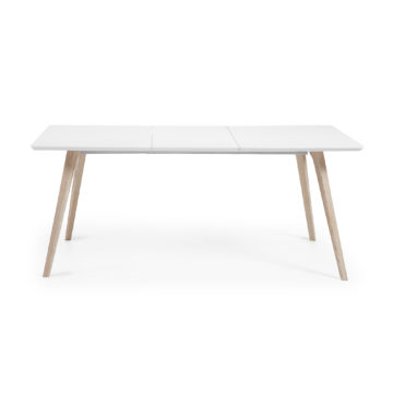 Raztegljiva jedilniška miza Quatre je izdelana iz MDF plošče v beli barvi, nogice pa so iz jesenovega lesa. Miza je kvalitetne izdelave in elegantnega videza, ter je enostavna za čiščenje. Primerna je za ljubitelje lesenih izdelkov in za moderne, kakor tudi klasične jedilnice.