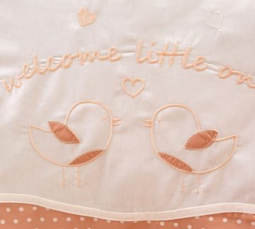 Posteljnina Romantic Baby je narejena iz najboljšega bombaža in je sestavljena iz prevleke za vzmetnico, zaščitne ograje, pregrinjala, odeje, okrasne blazine in prevleke za vzglavnik. Nežni toni in okrasno vezenje ji dajejo poseben čar.