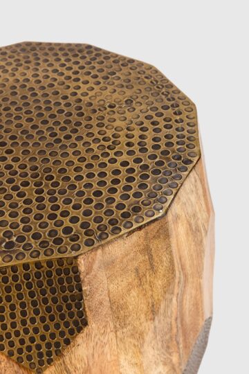 Okrogla klubska mizica Fabia iz masivnega mangovega lesa združuje ročno obdelan videz in etničen pridih. Značilen videz z dekorativnimi medeninastimi vložki doda karakter vsakemu prostoru, medtem ko kompakten premer omogoča enostavno uporabo kot stranska mizica ali dodatno sedišče.