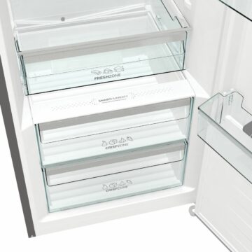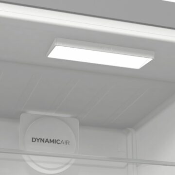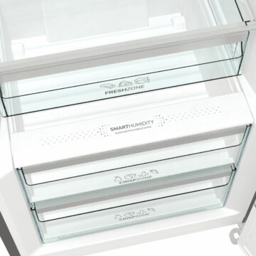 Varčevalni program EcoMode pomaga zmanjšati porabo energije, medtem ko osvetlitev hladilnega prostora z LED trakom na stropu poskrbi za odlično preglednost nad vsemi živili. Hladilnik je opremljen s šestimi steklenimi policami, žičnim nosilcem za steklenice, dve posodi za zelenjavo, posodico za jajca (8×) in FreshZone predalom za shranjevanje občutljivejših živil.