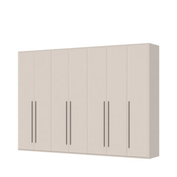 Sedemdelna garderobna omara Kalla Opera iz kolekcije Opera je prostorna in funkcionalna rešitev za organizacijo garderobe. Z dimenzijami 317 cm širine, 224 cm višine in 56 cm globine ponuja veliko prostora s štirimi garderobnimi palicami in dvanajstimi policami. Omara je zasnovana z eleganco, s prefinjenimi okrasnimi profiliranimi MDF okvirji in notranjostjo v tekstilnem dekorju. Mehko zapiranje tečajev in nastavljive noge zagotavljajo udobje in stabilnost, medtem ko visokokakovostni materiali in okovje omogočajo dolgotrajno uporabo.