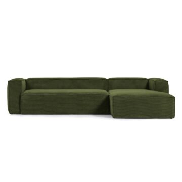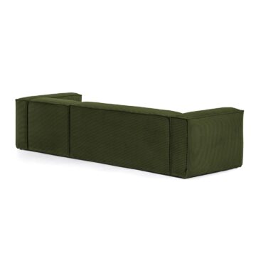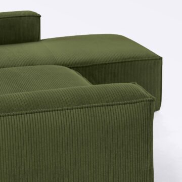 Sedežna garnitura Blok v zelenem žametu z desnim počivalnikom – 330 cm je oblečena v visokokakovosten zelen rebrast žamet, ki s svojimi širokimi šivi prinaša estetsko privlačnost. Z dimenzijami 330 cm dolžine, 174 cm globine in 69 cm višine, ponuja dovolj prostora za družinsko srečanje ali druženje s prijatelji.