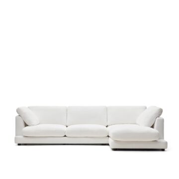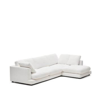 Sedežna garnitura Gala z desnim počivalnikom v beli barvi – 300 cm se ponaša z dimenzijami 300 cm v dolžino, 193 cm v globino in 87 cm v višino, kar omogoča udobno sedenje za večje število ljudi. Visoko kakovostni materiali, vključno z borovim lesom in recikliranimi vlakni, zagotavljajo dolgotrajno uporabo in trpežnost.