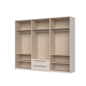 Šestdelna garderobna omara Kalla Opera P62 iz kolekcije Opera ponuja eleganco, funkcionalnost in vrhunsko kakovost. Z dimenzijami 272,5 cm širine, 224 cm višine in 56 cm globine nudi obilo prostora za shranjevanje oblačil in dodatkov, saj vključuje sedem polic, tri garderobne palice in dva prostorna predala. Mehko zapiranje tečajev in drsnikov zagotavlja tiho in udobno uporabo, medtem ko visokokakovostni materiali, kot so soft mat UV lak in Rehau robni trakovi, zagotavljajo dolgo življenjsko dobo omare.