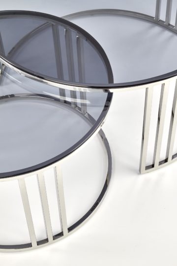 Plošči sta narejeni iz stekla. Steklo je malce zadimljeno. Čudovito izdelano podnožje je iz kromiranega jekla. Mizici sta okroglega in modernega dizajna ter na voljo v dimenzijah: