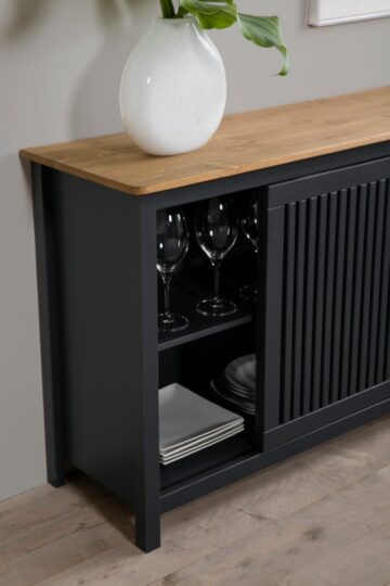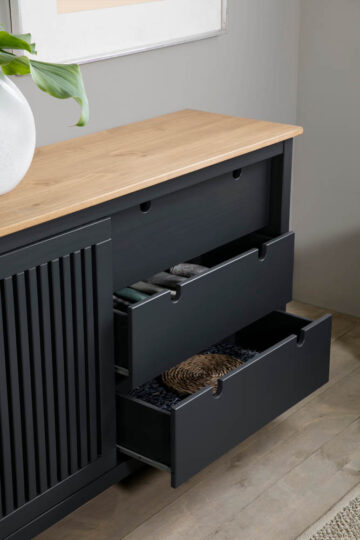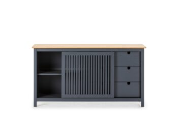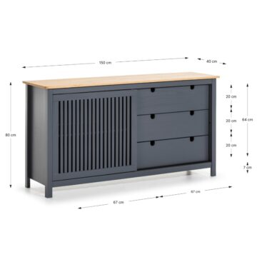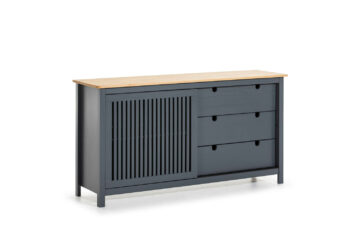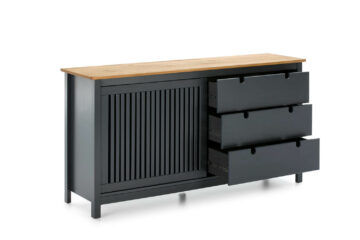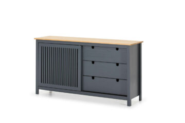 Komoda Bruna je izdelana iz masivne borovine, z drsnimi vrati in tremi predali, zaključena z lakom in voskom v sivi barvi.