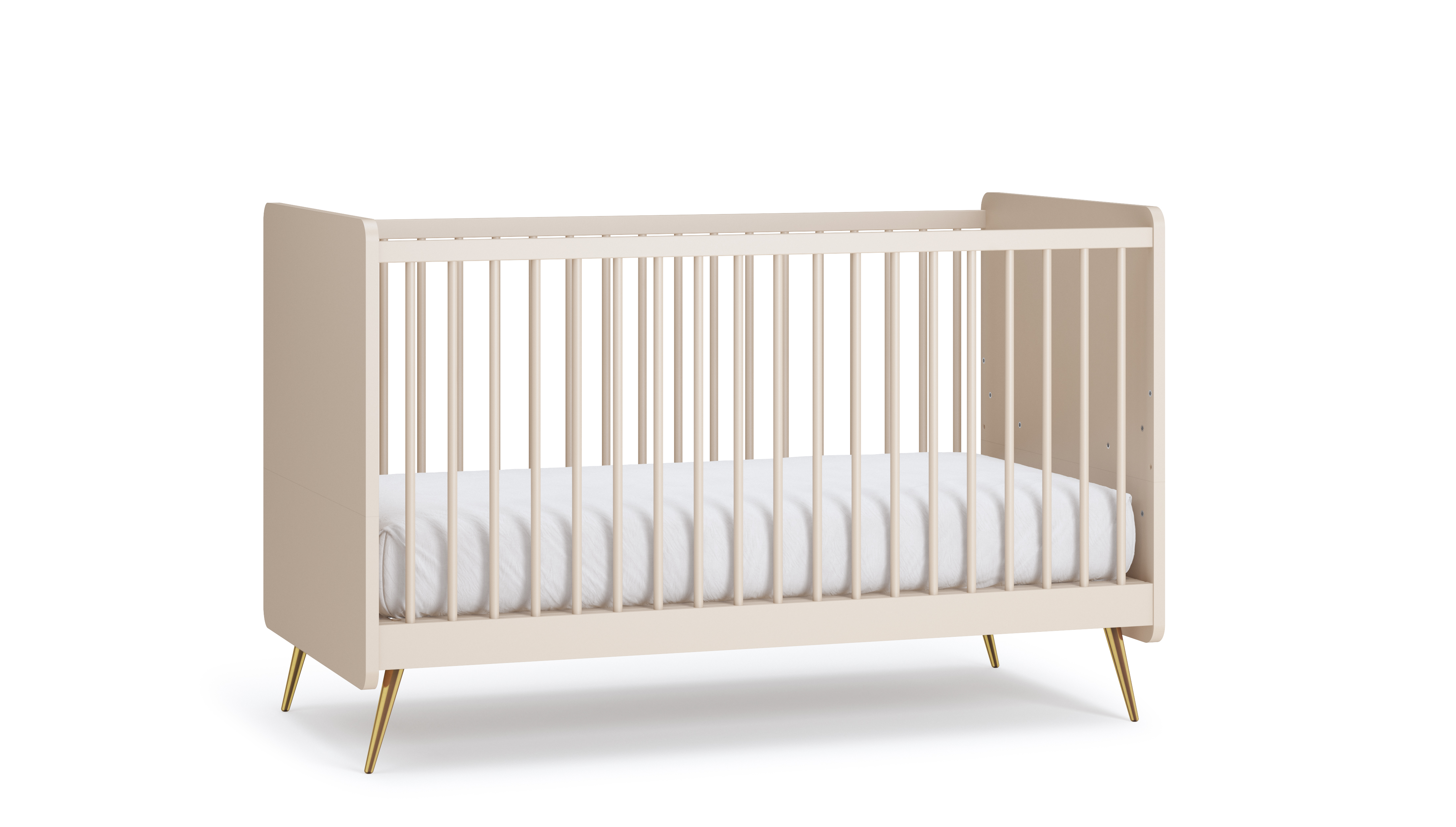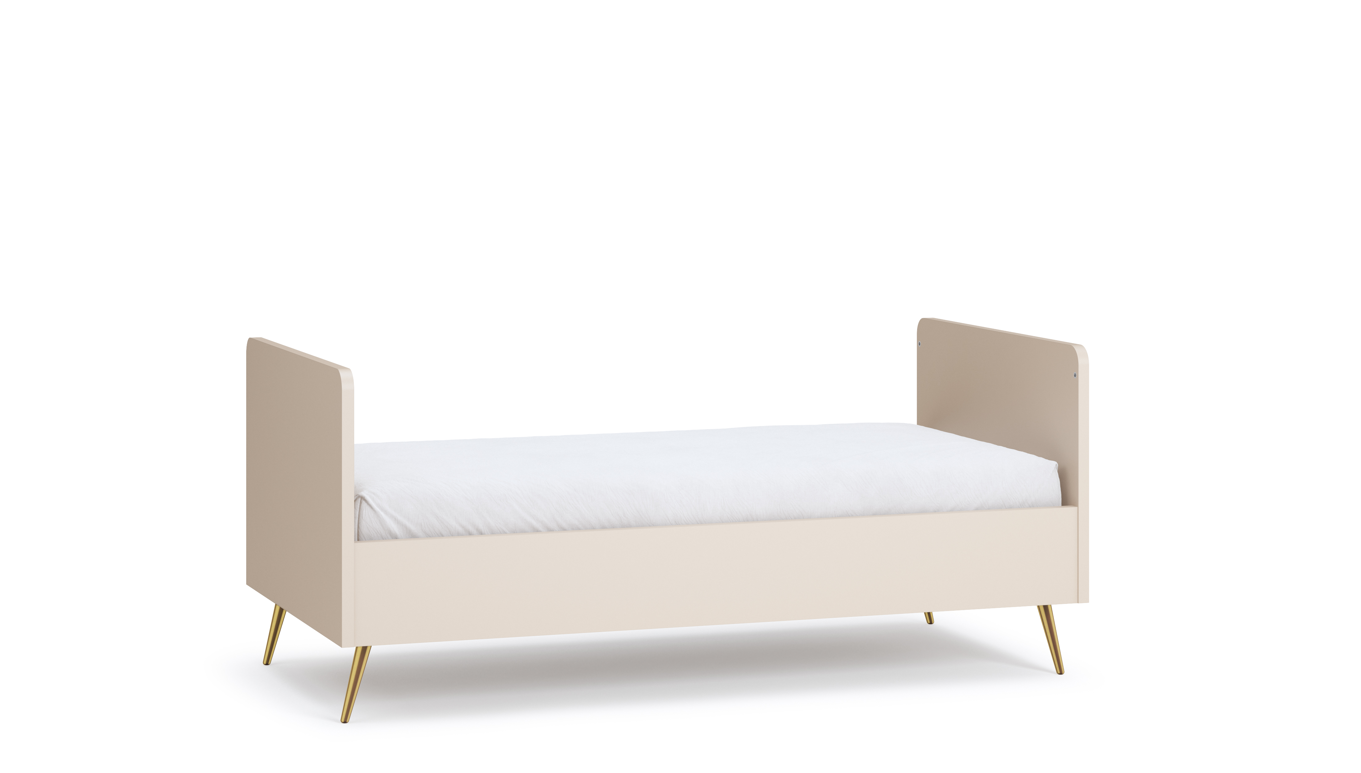 Elegantna posteljica raste z otrokom – od varnega ležalnega prostora z visokimi letvicami do prvega otroškega kavča, ko so vključene dodatne stranske plošče. Ležišče je nastavljivo na treh višinah, zaobljeni robovi pa dodajo varnost in estetsko mehkobo. Kovinske noge v zlati barvi (18 cm) poskrbijo za sodoben videz.