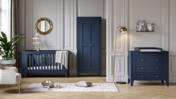 Komodo s previjalno mizico, opremljeno s tremi globokimi predali s tihim zapiranjem. Previjalna mizica se preprosto namesti in odstrani, komoda pa ostane uporaben kos tudi pozneje.