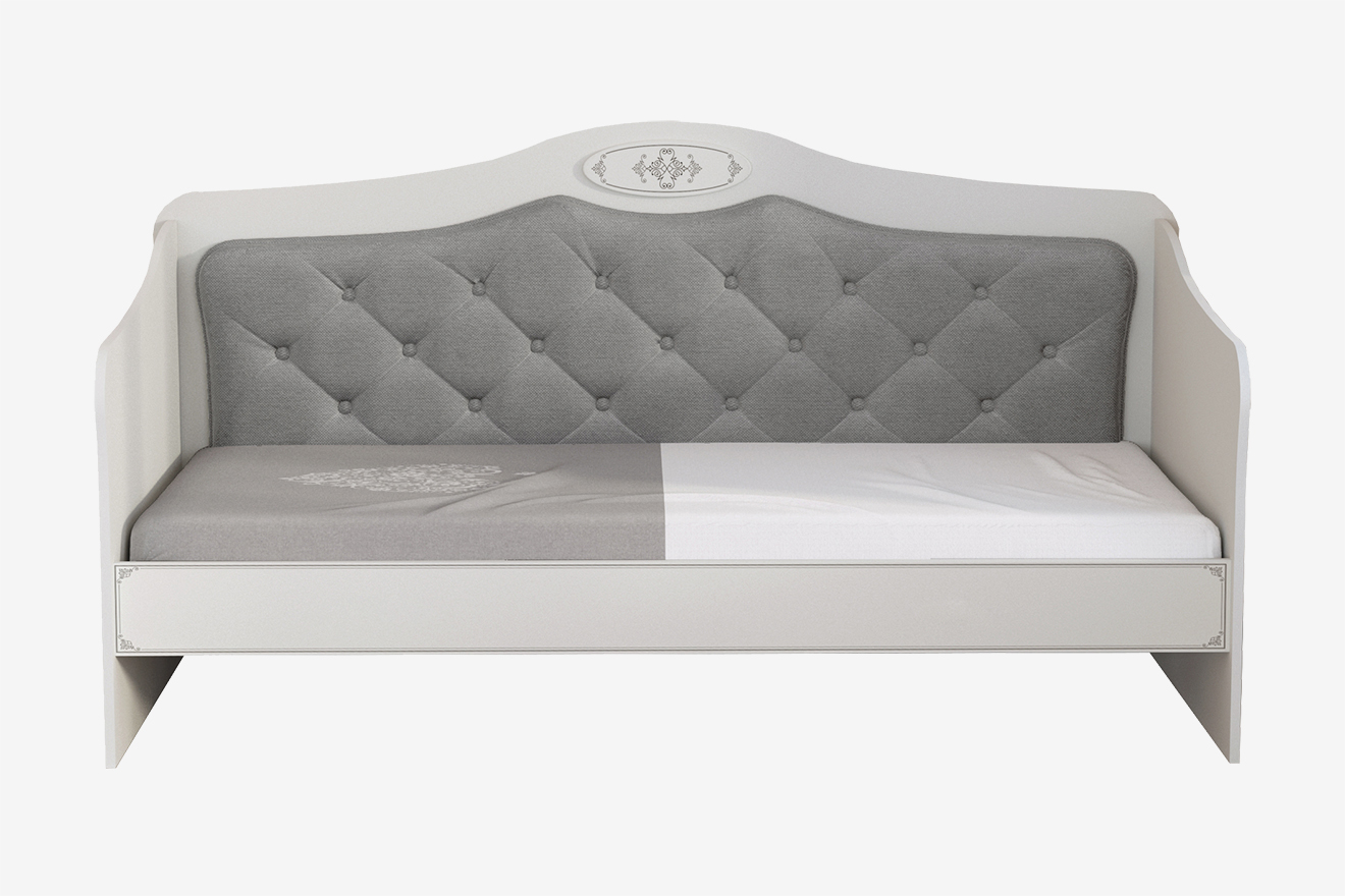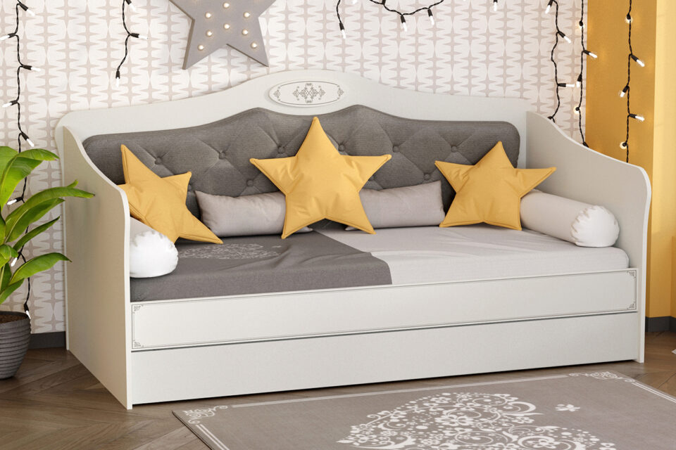 Sofa postelja Rustika iz kolekcije otroških sob Rustika združuje funkcionalnost in estetiko rustikalnega videza z modernimi proizvodnimi standardi. Z oblazinjenim hrbtiščem, ki odraža rustikalni stil, in belo barvo z dodatki v sivi, ta večnamenski kos pohištva ponuja udoben prostor za sedenje čez dan in se enostavno spremeni v udobno ležišče za noč.