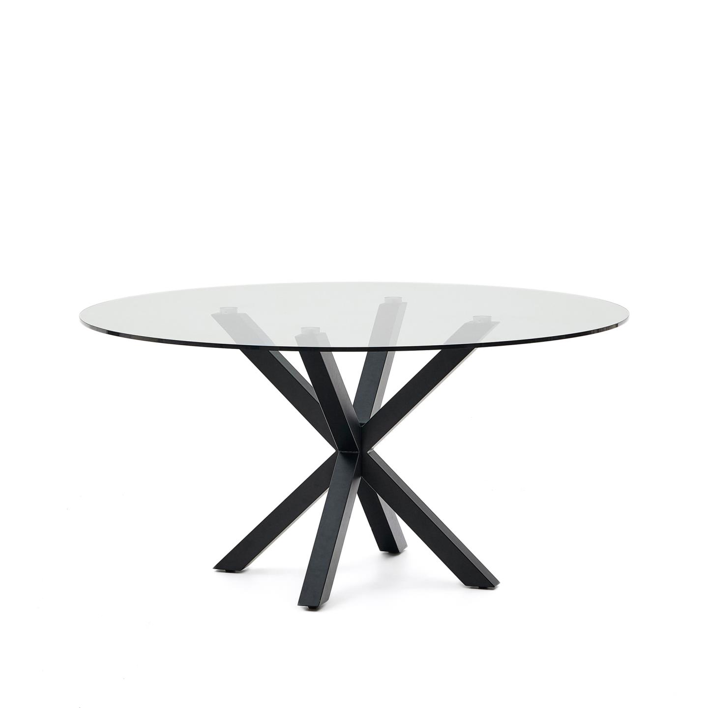 Dodajte sodoben in eleganten pridih vaši jedilnici z okroglo mizo Argo. Ta miza združuje prozorno stekleno površino in črne jeklene noge, kar ustvarja popolno kombinacijo za prijetna družinska kosila in posebne priložnosti.