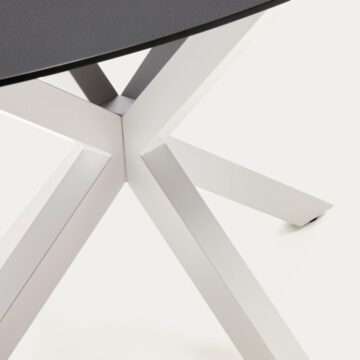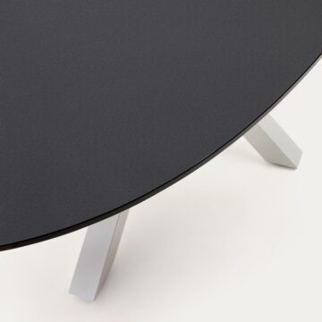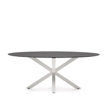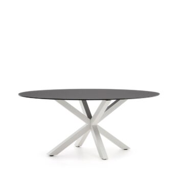 Elegantna ovalna miza Argo je zasnovana za uživanje v prijetnih družinskih obrokih in posebnih druženjih. Njena kombinacija mat črnega stekla in jeklenih nog z belim zaključkom prinaša v prostor sodoben in osupljiv estetski učinek, ki odlično dopolnjuje minimalistično ali sodobno opremljene jedilnice.