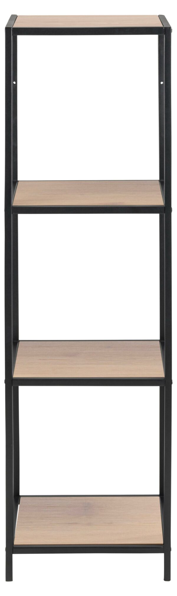 Enostavna stenska enota Seaford je tokrat dobila svojo nadgradnjo za tiste, ki si želite več. Tokrat ima stenska enota kar 3 police narejene iz iverne plošče, v odtenku divjega hrasta. Police najdemo znotraj kovinskega ogrodja, ki pa je prašno barvan v črno mat barvo.