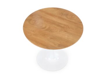 Jedilna miza Sting je kompaktna okrogla miza s ploščo v barvi zlatega hrasta in belimi kovinskimi nogami. Zaradi manjših dimenzij je odlična izbira za manjše prostore ali kot dodatna mizica v čakalnici.
