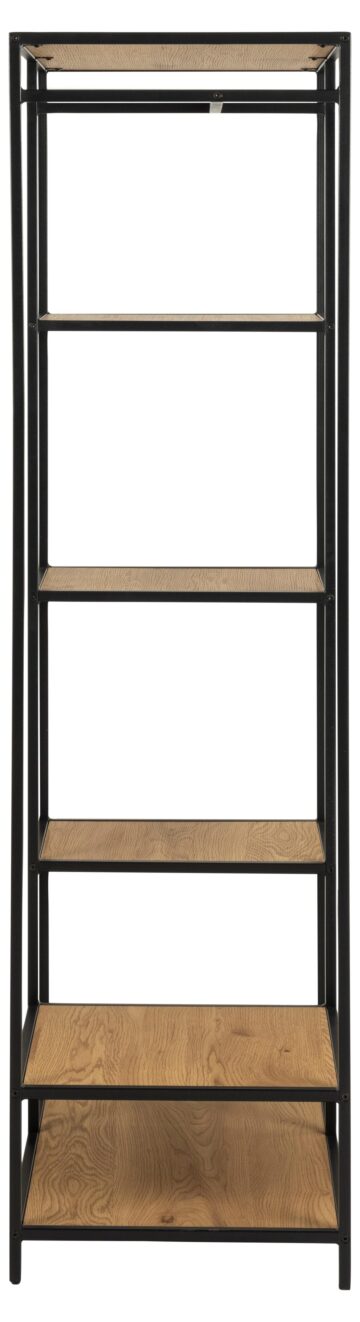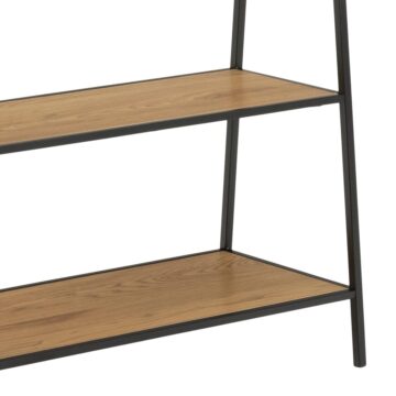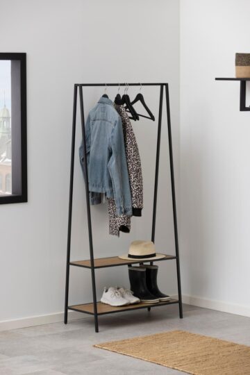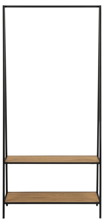 Stojalo za oblačila Seaford prinaša eleganco in praktičnost v vsak prostor. S svojo kombinacijo črnega kovinskega okvirja in polic iz divjega hrasta je idealna rešitev za shranjevanje oblačil in dodatkov.