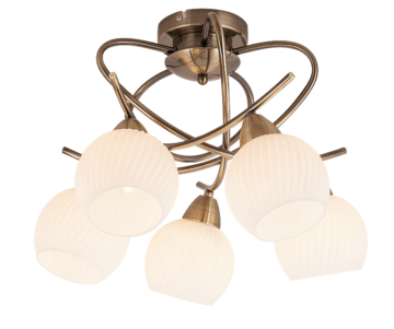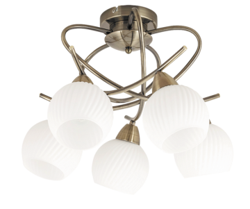 Tip svetila: notranje stropno svetilo 7120 Grlo: E-14 Barva: starinsko bronz Material: kovina/ steklo Maksimalna moč: 5 x 40 W Zaščita: IP20 Širina: 53 cm Višina: 30 cm Žarnica: ni vključena v ceno