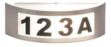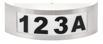 Tip svetila: zunanje stensko svetilo 8749 Grlo: E-27 Barva: nerjaveče jeklo Material: kovina/ plastika Maksimalna moč: 14 W varčna ali LED Zaščita: IP44, UV odporno Višina: 10 cm Širina: 31,8 cm Žarnica: ni vključena Posebnost: 3 x komplet nalepk s številkam od 0 do 9 in 1 x komplet črk