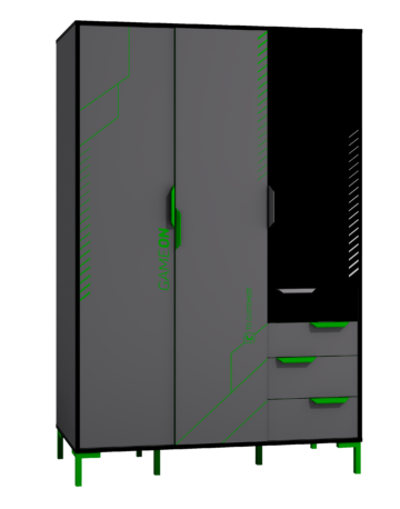 Klasična omara Gaming je sodobno darilo za vse igralce in popolna kombinacija dinamike in elegance. Antracitne površine v harmoniji z zelenimi detajli dodajo prostoru energijo in ustvarjajo prijetno vzdušje. Z velikimi prostori za shranjevanje omogoča varno hrambo vaše igralne opreme, kar prispeva k urejenosti in funkcionalnosti sobe.