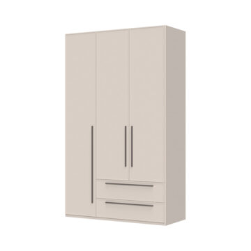 Trokrilna garderobna omara Kalla Opera P32 iz kolekcije Opera ponuja kombinacijo elegance, funkcionalnosti in sodobnega dizajna. Z dimenzijami 137 cm širine, 224 cm višine in 56 cm globine zagotavlja veliko prostora za shranjevanje z dvema garderobnima palicama, štirimi policami in dvema prostornima predaloma. Lakirana z mehkim mat UV lakom v barvi Kašmir, okrasne profilirane fronte in notranjost v tekstilnem dekorju prinašajo prefinjen in eleganten pridih. Omara je opremljena z mehkim zapiranjem tečajev in drsnikov, ki zagotavljajo tiho in nemoteno delovanje, medtem ko dodatki izboljšujejo funkcionalnost in vzdržljivost.