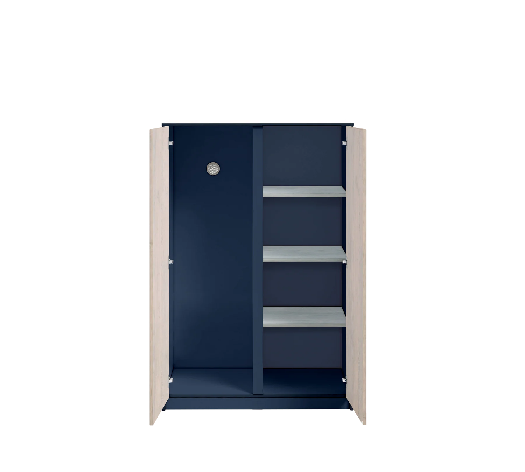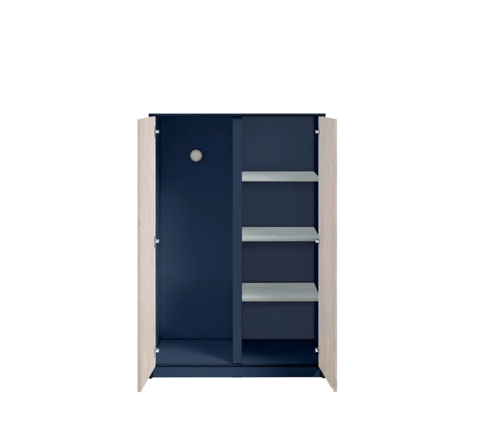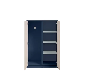 Modularni sestav otroške sobe Tris ponuja izjemno prilagodljivost in optimalen izkoristek prostora, saj omogoča več različnih postavitev. Sodoben dizajn v svetlo modri, temno modri in sivi barvni kombinaciji se popolnoma prilega dinamičnemu otroškemu ali mladinskemu prostoru.