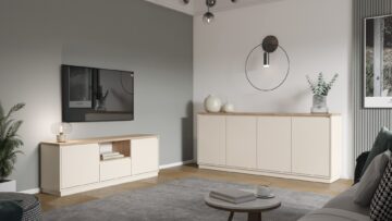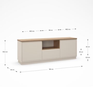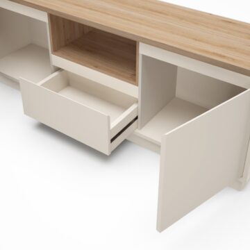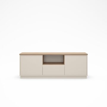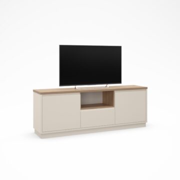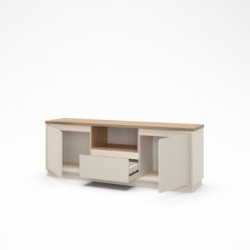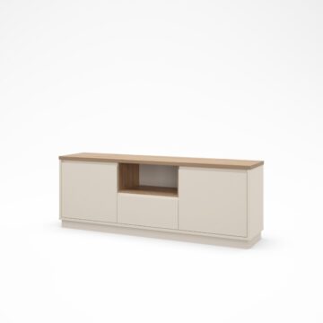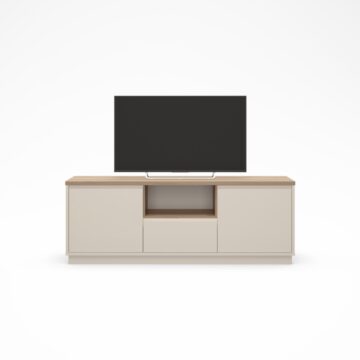 TV omarica Loreta združuje nežno bež barvo in svetel dekor hrasta, ki ustvarjata harmoničen videz za sodobne in umirjene interierje. Njena zasnova ponuja ravno pravo ravnovesje med odprtim prostorom za elektroniko in zaprtim shranjevanjem za vsakodnevne potrebščine.