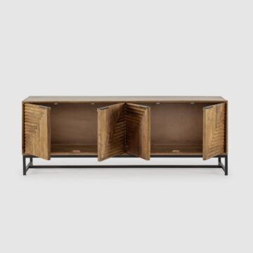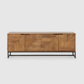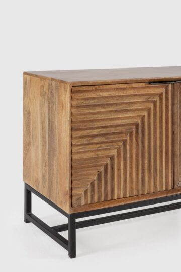 TV omarica Nereida iz masivnega mangovega lesa očara z geometrijsko strukturo vrat in toplim, naravnim odtenkom. Z elegantnim kovinskim podnožjem in ročno dodelano površino prinaša brezčasen pridih v vsak dnevni prostor.