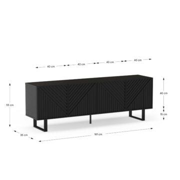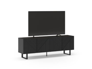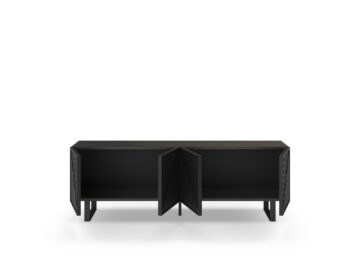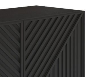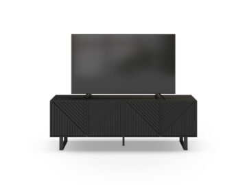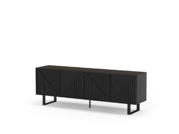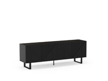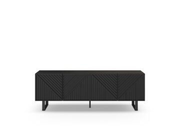 TV omarica Peta s poudarjenim geometrijskim vzorcem na vratih in popolnoma črnim videzom prinaša izrazit sodoben značaj. Idealna za minimalistične ali industrijsko zasnovane dnevne prostore, kjer potrebujete eleganten in funkcionalen kos pohištva.