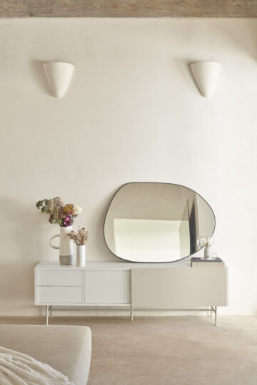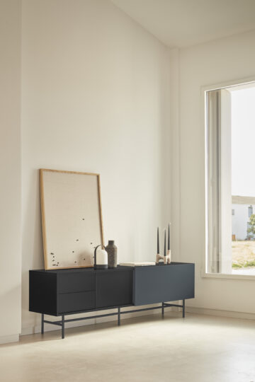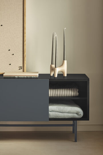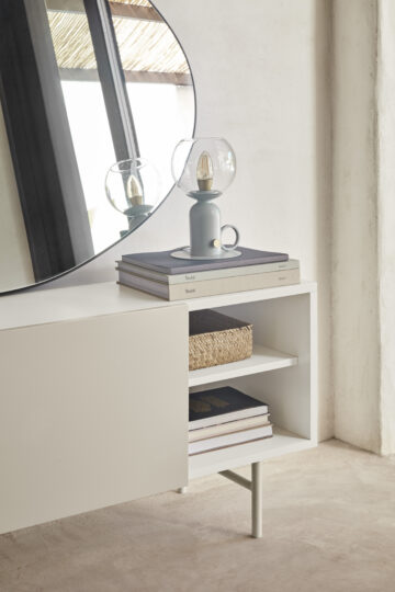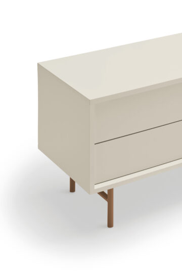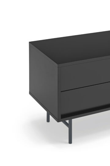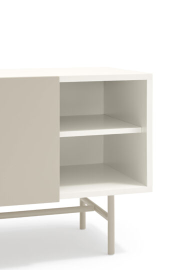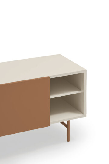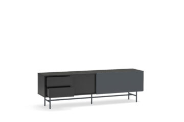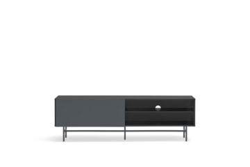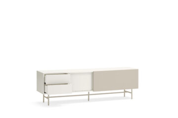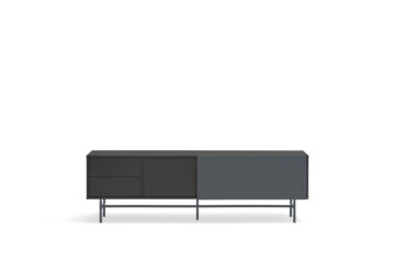 Izkoristite prostor pod televizijo pametno in učinkovito. Minimalistična TV komoda Nube nudi eleganten in praktičen prostor za shranjevanje. Dizajnerski TV regal v atraktivnih barvnih kombinacijah ima 2 predala, 1 polico skrito za vratci in 2 polici, ki ju lahko zakrijete s premičnimi vrati. Prav tako boste cenili praktične izreze na zadnji strani za enostavno priključitev vaših multimedijskih predvajalnikov in igralnih konzol. Zahvaljujoč izvedbi brez ročajev se poudarijo preproste in čiste linije TV komode. Praktičen sistem Push to open omogoča enostavno odpiranje predalov in vrat brez ročajev. Uporaba lakiranega MDF zagotavlja enostavno vzdrževanje in visoko odpornost. TV regal je na voljo v treh barvnih izvedbah: