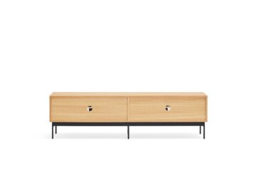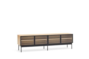 Komoda Blur ima štiri vrata z rebrastim steklom in štiri notranje police, ki omogočajo učinkovito organizacijo vseh elektronskih naprav in dodatkov. Zasnovana je za udobno in praktično uporabo, hkrati pa ohranja estetski videz.