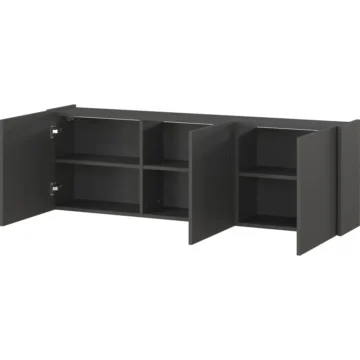 TV komoda Piana s štirimi vrati in elegantno ozko globino je odlična rešitev za manjše dnevne sobe ali hodnike, kjer je prostor omejen. Kljub kompaktnim meram ponuja veliko prostora za shranjevanje in poskrbi za urejen videz prostora.