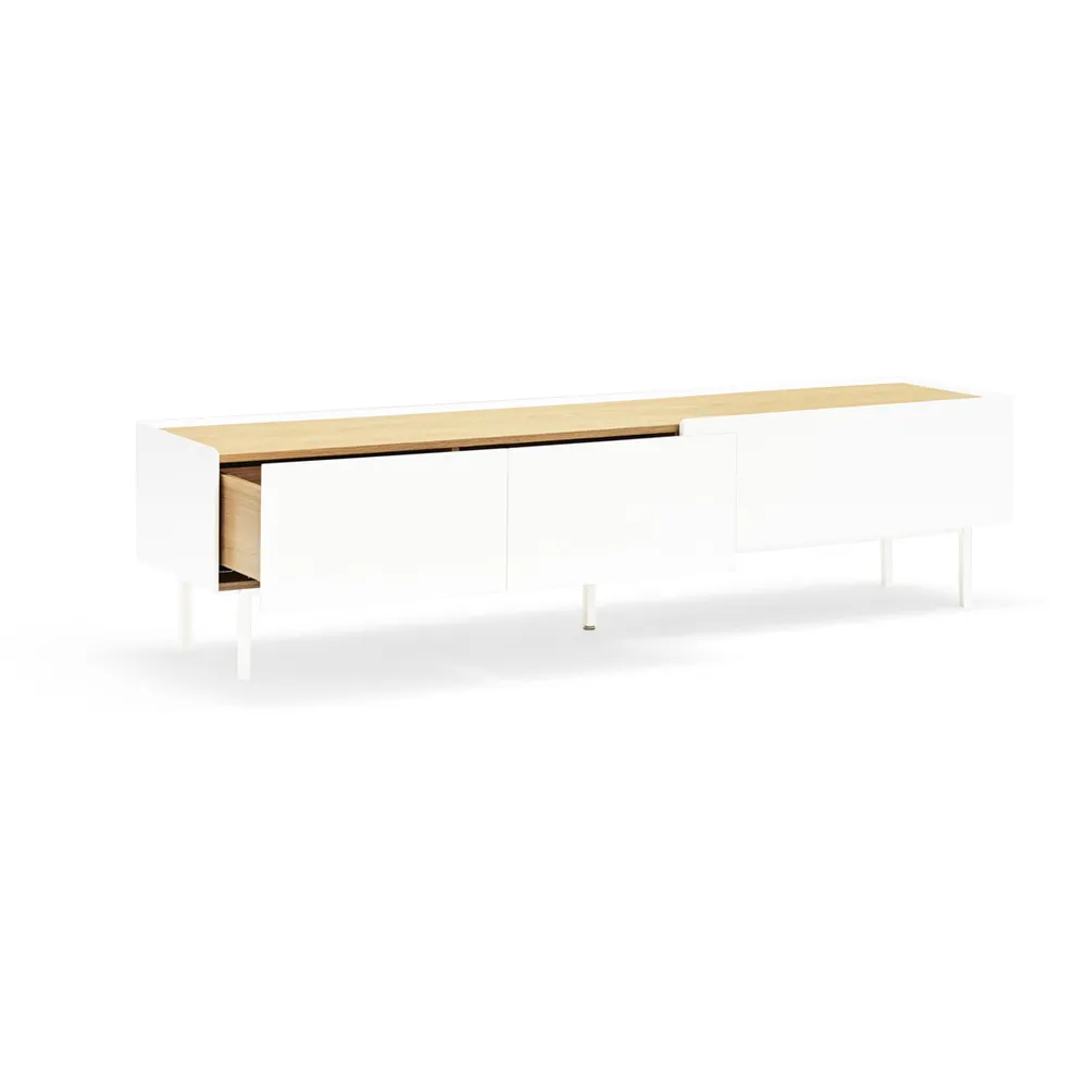TV omarica ima dva predala na levi strani in dvižna vrata na desni strani. V notranjosti dvižnih vrat je skrita luknja za električne kable.