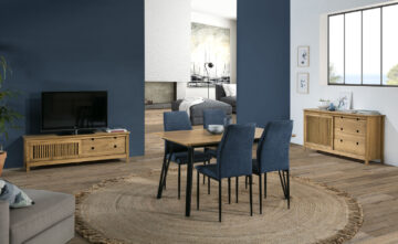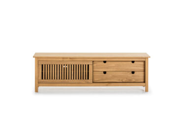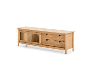 TV omarica Bruna je razgibanega videza, ki ga nekoliko nevtralizira razmeroma enostavna kombinacija naravnega okvirja in lesene plošče. Ima drsna vrata, izdelana iz deščic, in za njimi polico, ter dva brezročajna predala. V celoti je izdelana iz borovega lesa.
