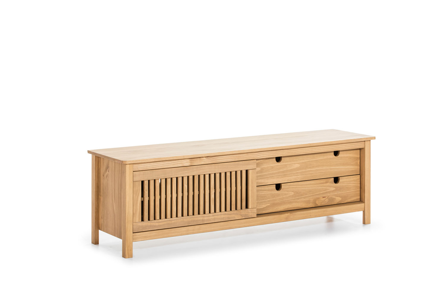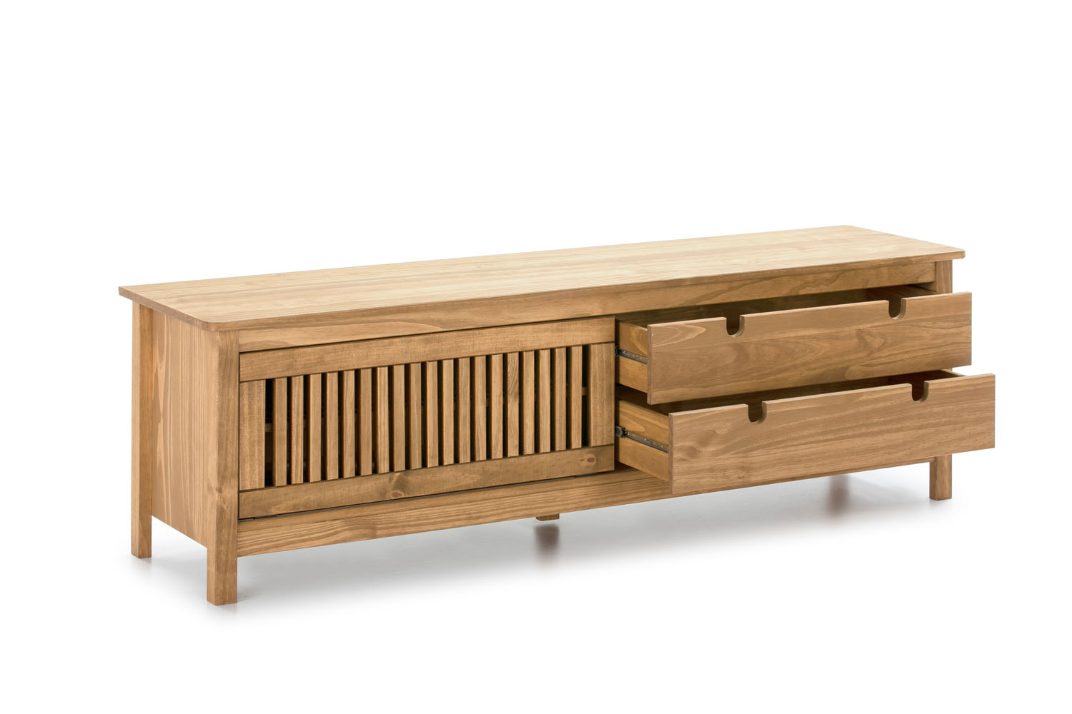 TV omarica Bruna je razgibanega videza, ki ga nekoliko nevtralizira razmeroma enostavna kombinacija naravnega okvirja in lesene plošče. Ima drsna vrata, izdelana iz deščic, in za njimi polico, ter dva brezročajna predala. V celoti je izdelana iz borovega lesa.
