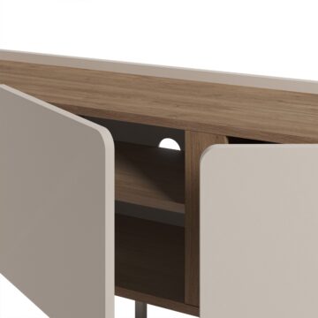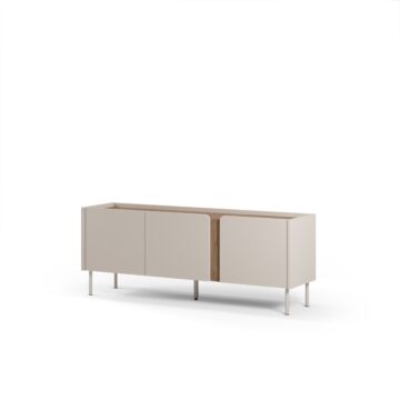 TV omarica Lucile v elegantni kombinaciji krem barve in dekorja svetlega hrasta je sodobna rešitev za dnevne sobe, ki iščejo minimalistični dizajn in praktičnost. Zaobljeni robovi vrat dodajo mehkobo videzu, medtem ko kovinske nogice v beli barvi poskrbijo za stabilnost in svežino v prostoru.