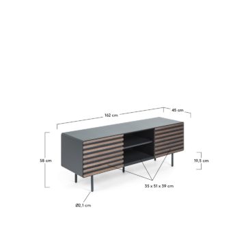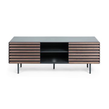 Elegantno TV omarico Mahon odlikuje trenden črtast dizajn. Izdelana je iz kakovostne MDF plošče, oblečene v lešnikov furnir, in trpežnega jekla. Ima precej prostora za shranjevanje ter dve drsni vrati.