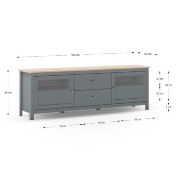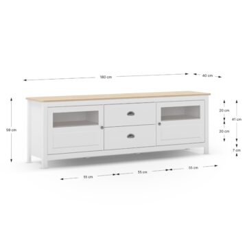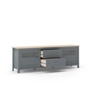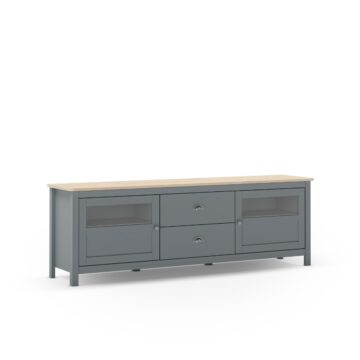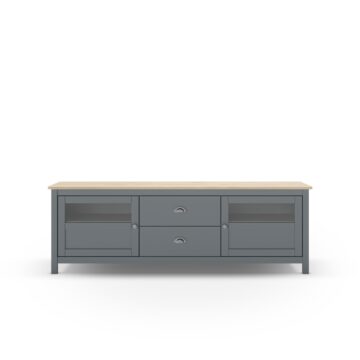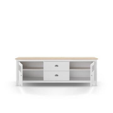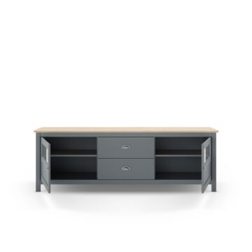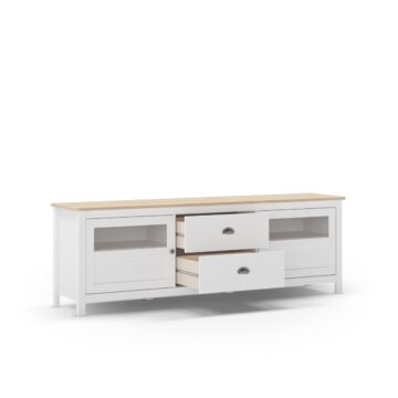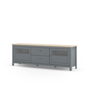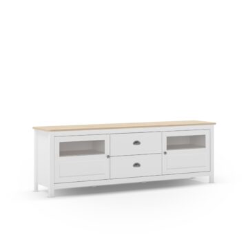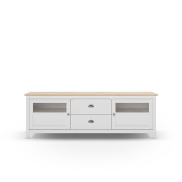 TV omarica Misti iz masivne borovine združuje rustikalni videz in sodobno funkcionalnost. Na voljo v dveh barvah – zeleni in beli – ponuja kombinacijo zaprtih omaric, steklenih vrat in dveh prostornin predalov za urejeno shranjevanje elektronskih naprav, kablov in dodatkov.