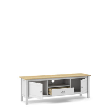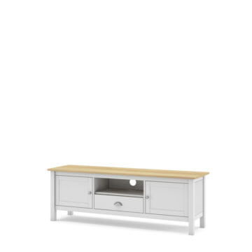 TV omarica Misti, meri 158 cm v širino, 40 cm v globino in 53 cm v višino, združuje funkcionalnost in sodoben dizajn, idealno za dnevni prostor. Narejena iz visokokakovostnega borovega lesa, omarica vabi s kombinacijo bele barve in akcentov hrastovega lesa, kar ji daje privlačen, sodoben izgled z naravnim dotikom.
