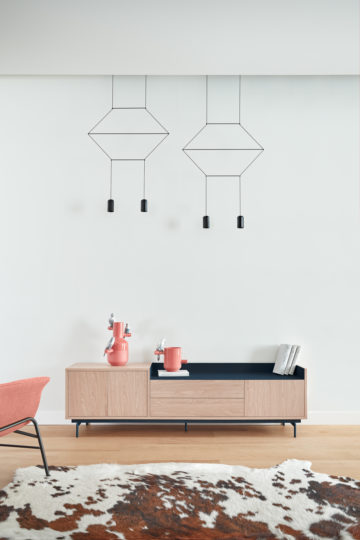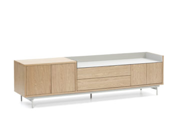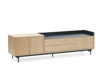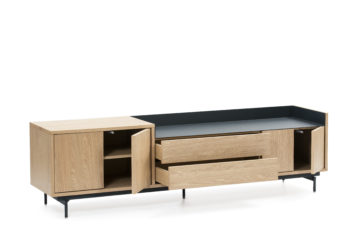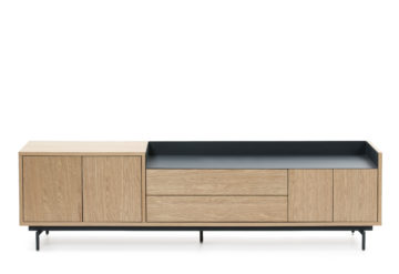 Kolekcija Valley temelji na univerzalnosti, tesno povezani z elegantnostjo. Ostre in jasne linije, novodoben sistem odpiranja na dotik in hrastov furnir so samo nekatere od zamisli kreativnega Cambre Designa. Vsak Valley kos je harmoničen primer spoja lesa in kovine. TV omarica je izdelana iz MDF plošče, obogatene s furnirjem svetlega hrasta, pločevine in kovine. Za shranjevanje ima tri vrata in dva predala. Izberete lahko barvo pločevine, ki se nahaja desno zgoraj: 1. Bela 2. Temno modra Dimenzija (dolžina x širina x višina): 180x40x50 cm Kljub svoji fleksibilnosti, stoji najbolje v zasedbi sorodnih izdelkov.